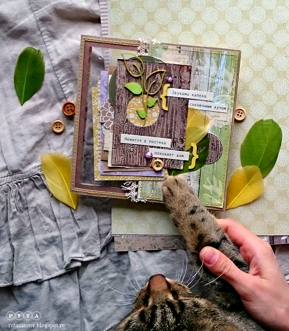 На втором этапе я продолжила тему, и для оставшегося текста песни сделала ещё открытку. Она тоже со сквозным окошком, только уже квадратным. Использовала скетч 1. Из обязательных элементов: многослойные подложки, перья, деревянный фон (это эмбоссинг фактуры дерева, раскрашенный спреем), деревянная пуговка. В кадре у меня рука лапа кота, и моя лапа рука)))